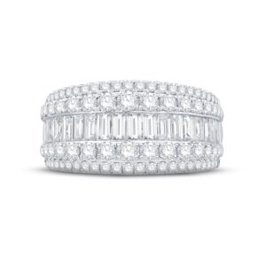 Delight her with this splendid anniversary ring. Featuring radiant rows of round diamonds that sparkle above and below a shimmering channel-set row of baguette-cut diamonds, the ring is fashioned in lustrous 14K white gold. The diamonds total an impressive 2 carats in weight. From the Now and Forever? bridal collection.